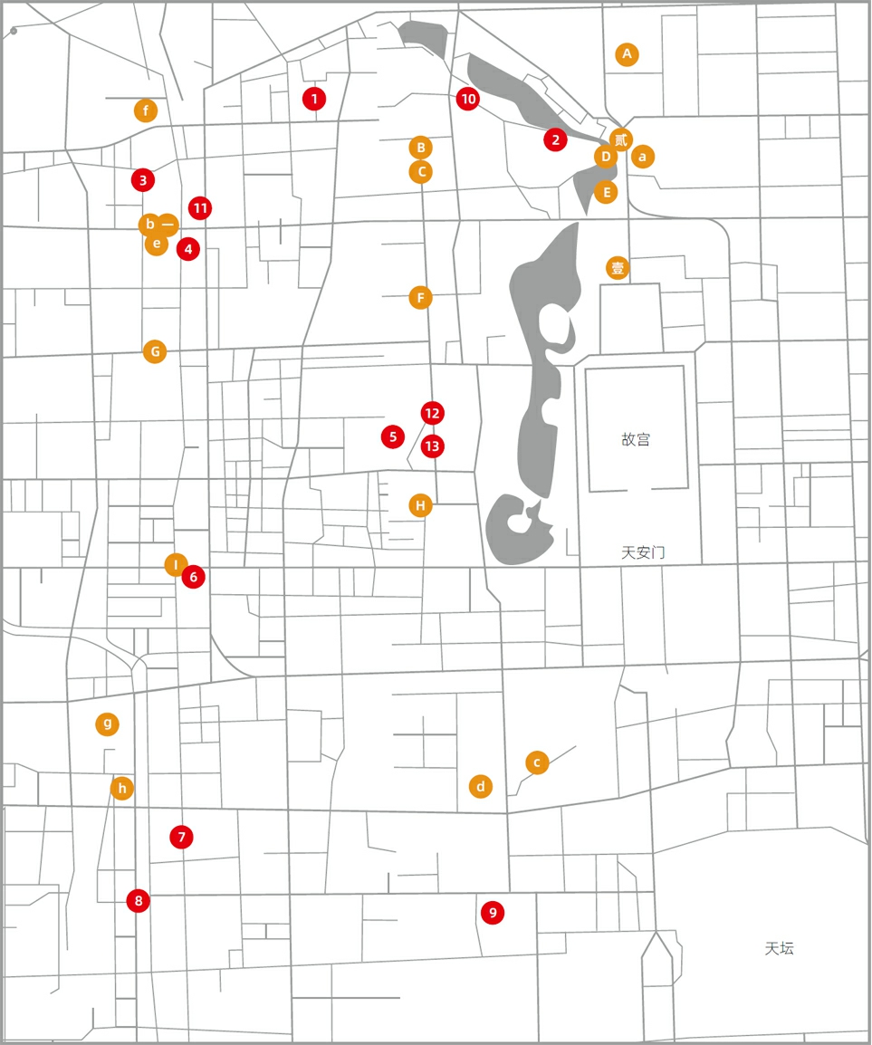 A.憨食薈 B.新街口百貨 C.天恒城市之光酒店 & 旅舍 * D.新地佰 E.友誼中新- 北平匯 F.成文厚 G.瓷氣餐廳 * H.西西 & 素心餐廳 I.復興商業城